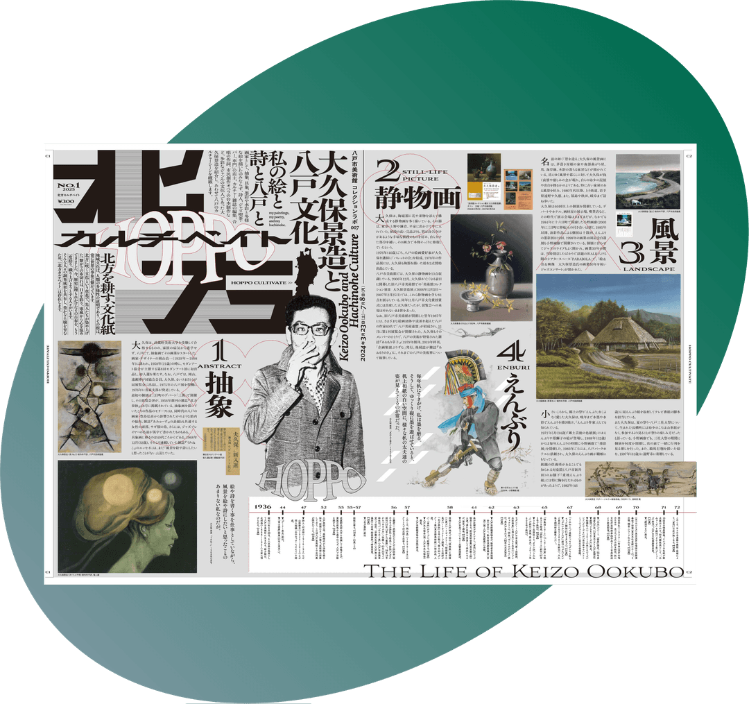 これまでの地域文化史の形成・整理を補完する取組みです。一定の調査をもとに行われながらも、図録として残らない小規模な展覧会等の内容を、大きなタブロイド紙「北方カルチベイト」にまとめ、刊行しています。また、昭和の時代に地域の文化人や芸術家、経済人などと交流し出版物等を手掛けてきたデザイナーに着目することにより、新たな視点で地域社会や人の交流、文化の在り方をとらえる「八戸のデザイン史展」も企画しています。これらの活動は、特に「クリエイティブとデザインのアソビス」とともに活動しています。